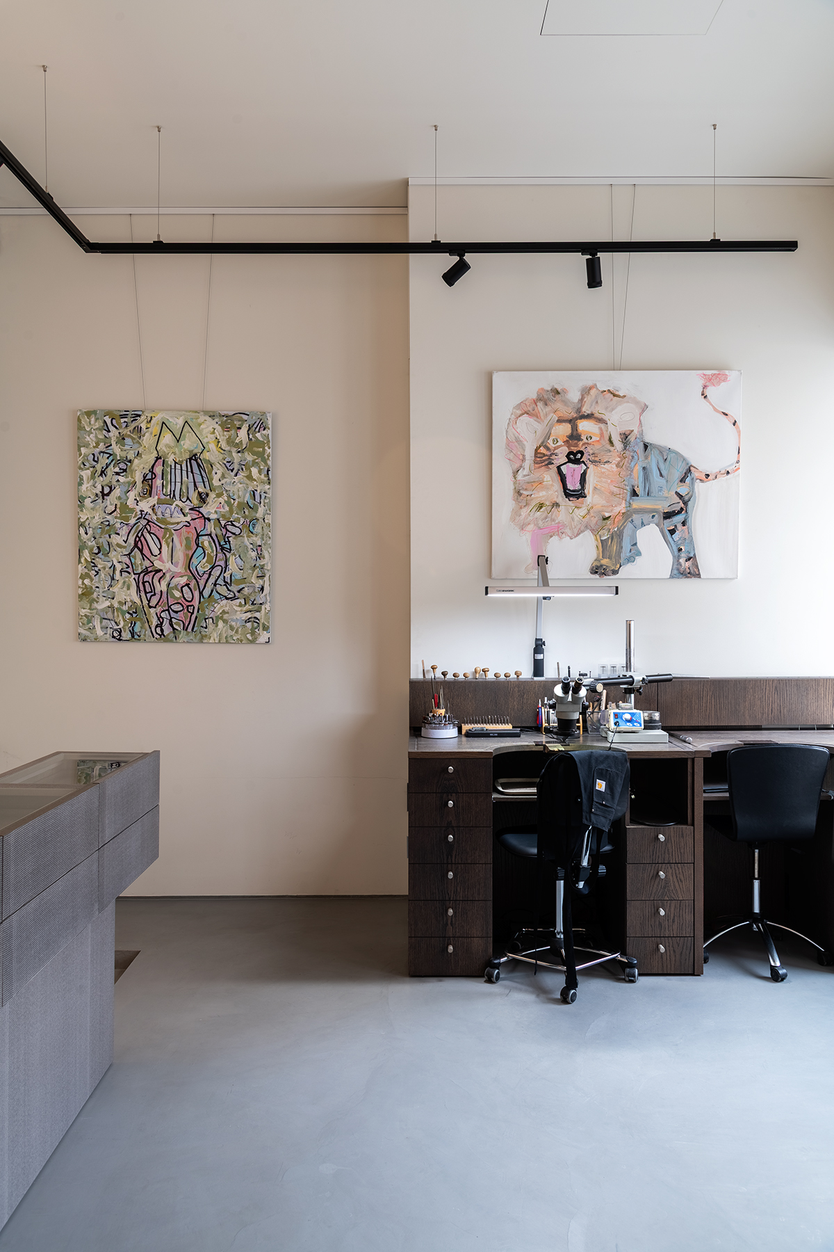 57 Edges studijoje, kur gimsta individualūs juvelyriniai dirbiniai, veikia ir mini galerija Vilniuje, pristatanti šiuolaikinę tapybą. Čia eksponuojami menininko Roko Pralgausko darbai, kviečiantys į dialogą tarp skirtingų meno formų – metalo, formos, spalvos ir pasakojimo.